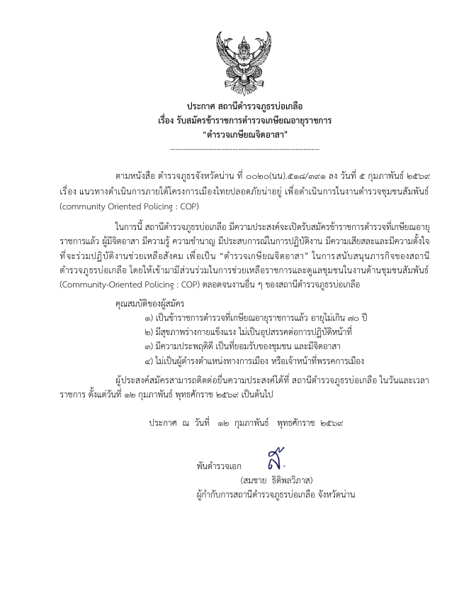วันที่ 10 กุมภาพันธ์ 2569 เวลา 13.30 น. พ.ต.อ.สมชาย ธิติพลวิภาส ผกก.สภ.บ่อเกลือ , พ.ต.ท.สุทธิศักดิ์
