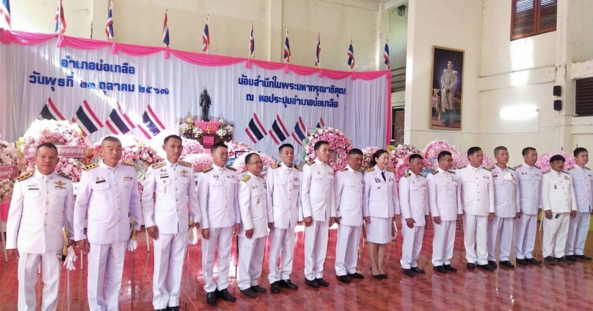 วันที่ 23 ตุลาคม 2567 เวลา 08.00 น. โดยการอำนวยการของ พ.ต.อ.จักรียุทธ โชติวชิระพงศ์ ผกก.สภ.บ่อเกลือ มอบหมายให้ พ.ต.ท.ปรีชา ปรารมภ์ สว.อก.สภ.บ่อเกลือ พร้อมข้าราชการตำรวจ สภ.บ่อเกลือ ร่วมพิธีวางพวงมาลาและถวายราชสดุดี เนื่องในวันปิยมหาราช โดยมีหัวหน้าส่วนราชการ และข้าราชการทุกหมู่เหล่าเข้าร่วมพิธี